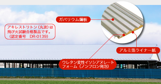 亜鉛アルミ合金メッキを施したガルバリウム鋼板を表面材に使用しています。